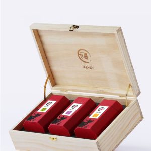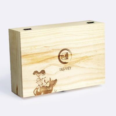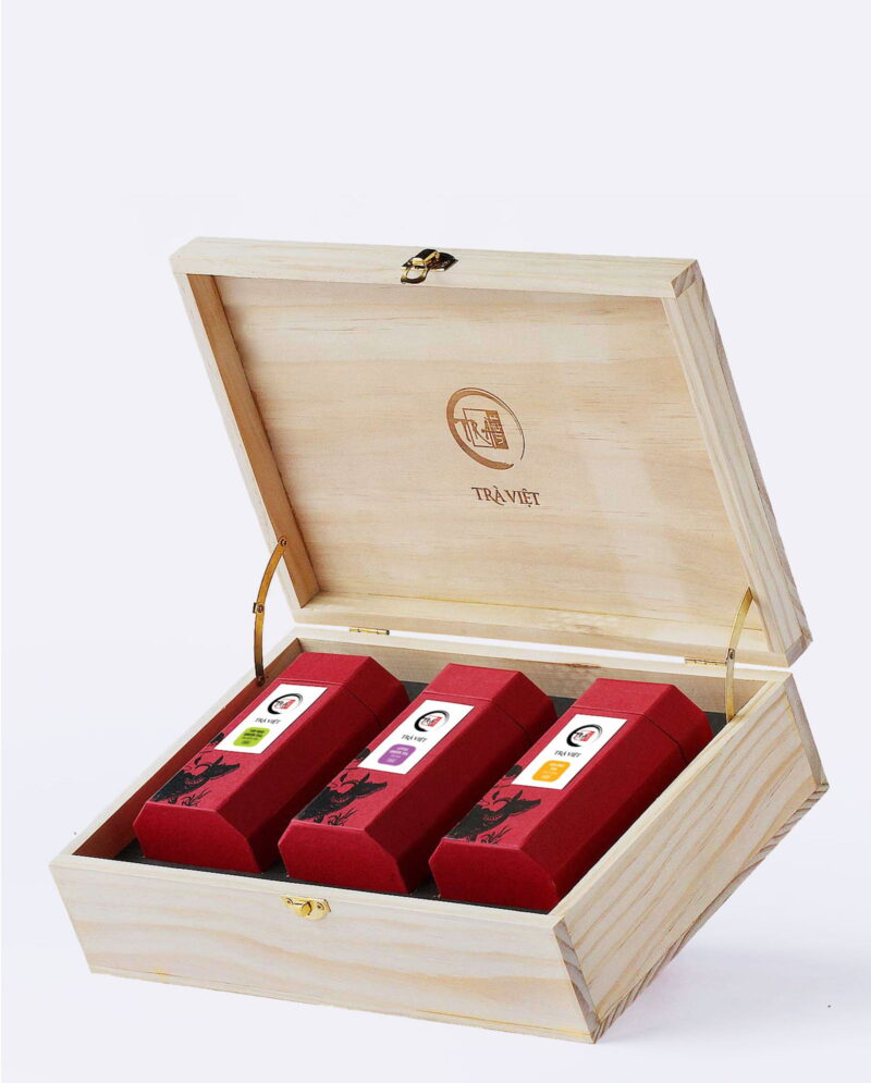 - Hộp trà Tri Ân, chất liệu gỗ thông New Zeland,Khóa và bản lề bằng đồng. Mặt trên ép nhiệt hoa văn “Mục đồng thổi sáo” và logo Trà Việt. Bên trong đệm giấy nghệ thuật đen, có 3 hộp trà bát giác mầu đỏ.